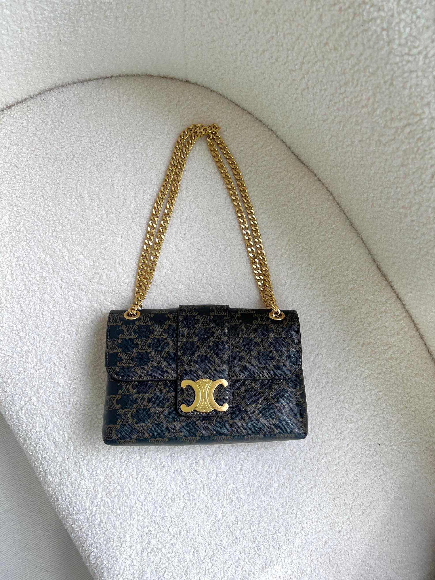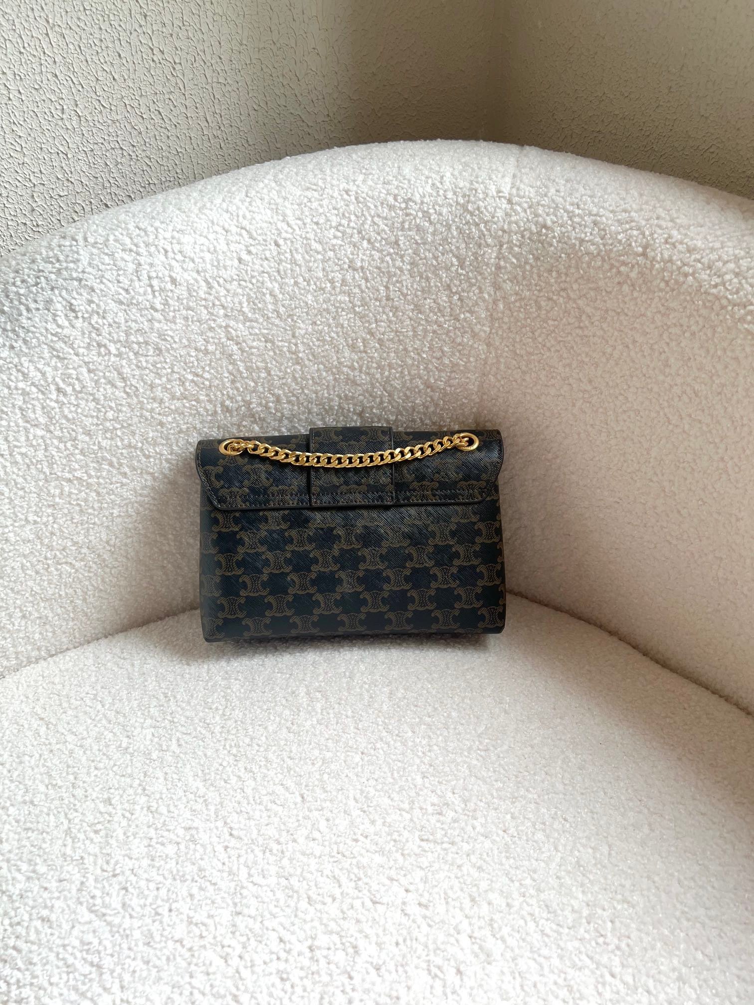 The newly released Victoire chain bag is crafted with textured leather to create a square silhouette and is paired with a golden sliding chain shoulder strap, exuding the style of a Tomboy cool girl. Another Tily handbag features a playful crescent silhouette that sets off the Triomphe emblem, revealing the sweet charm of a girl next door.