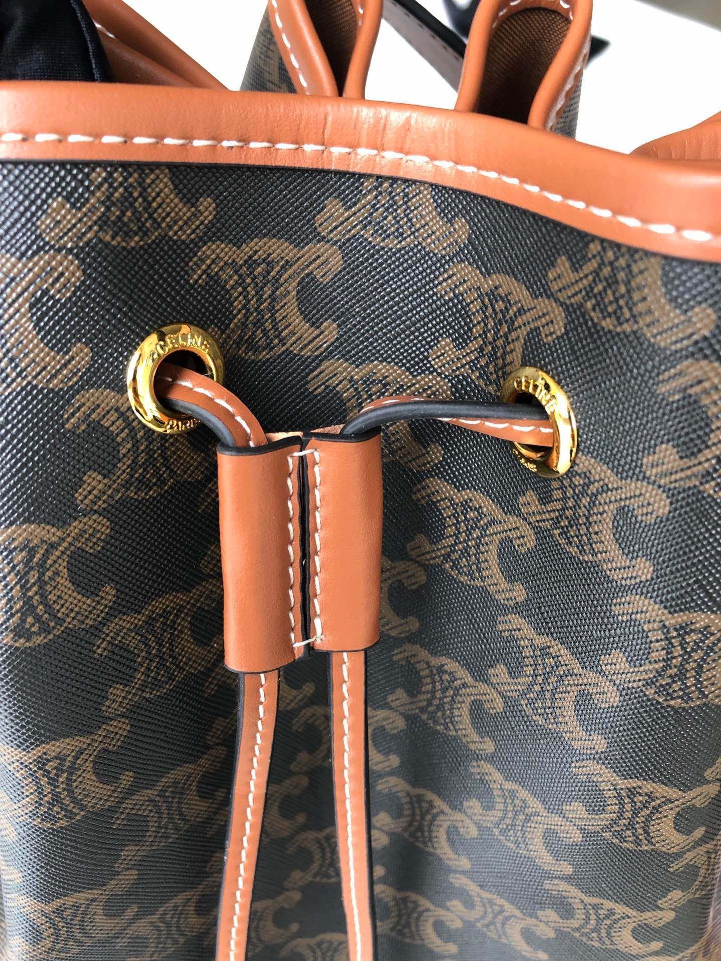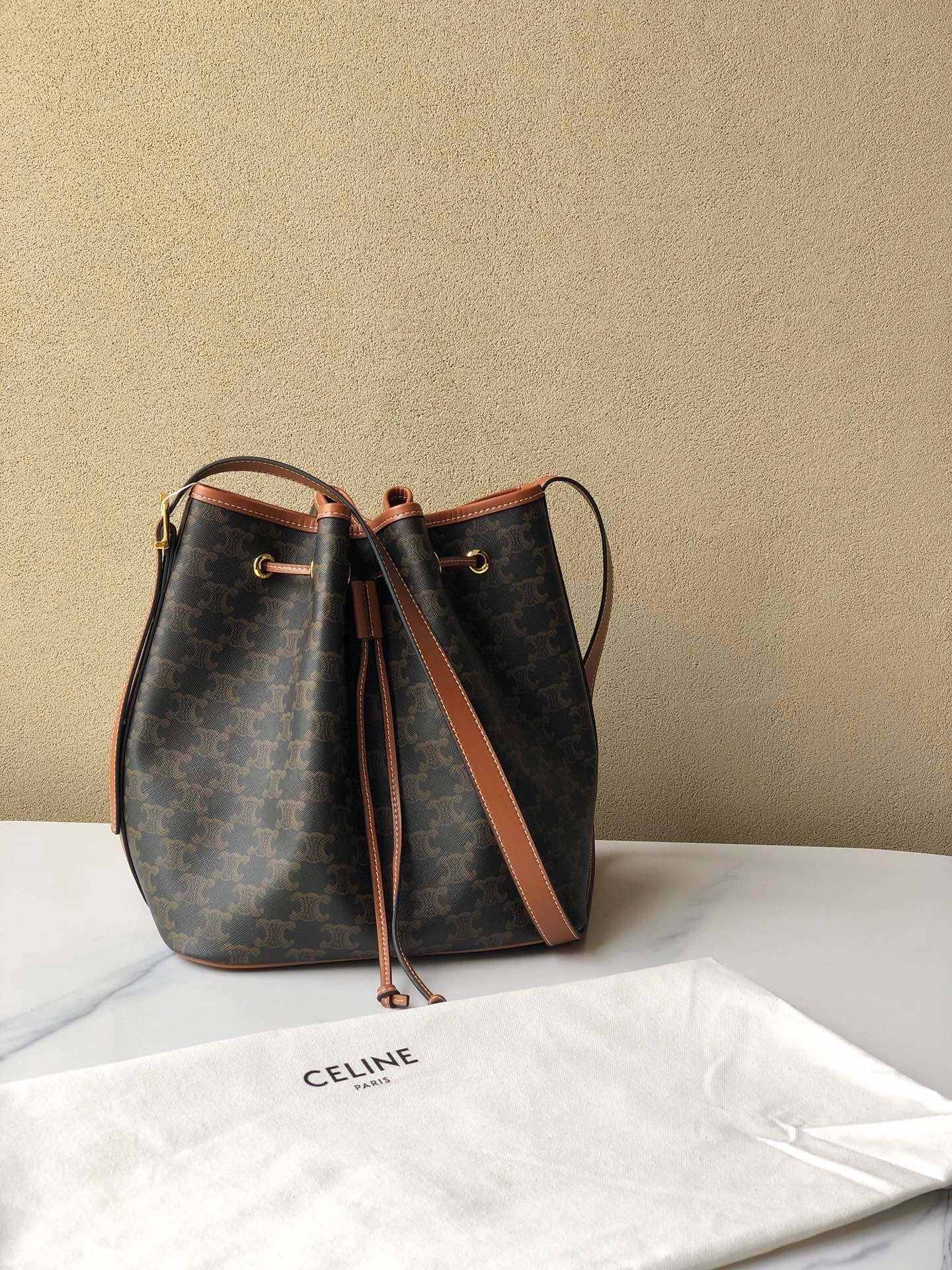 👑CELINE medium TRIOMPHE canvas drawstring bag, vintage crossbody. With internal label. 61% coated canvas, 39% calfskin. Crossbody and shoulder carry. Drawstring genuine leather strap. Adjustable leather shoulder strap. Length 50cm. Size: 24X27X19cm.