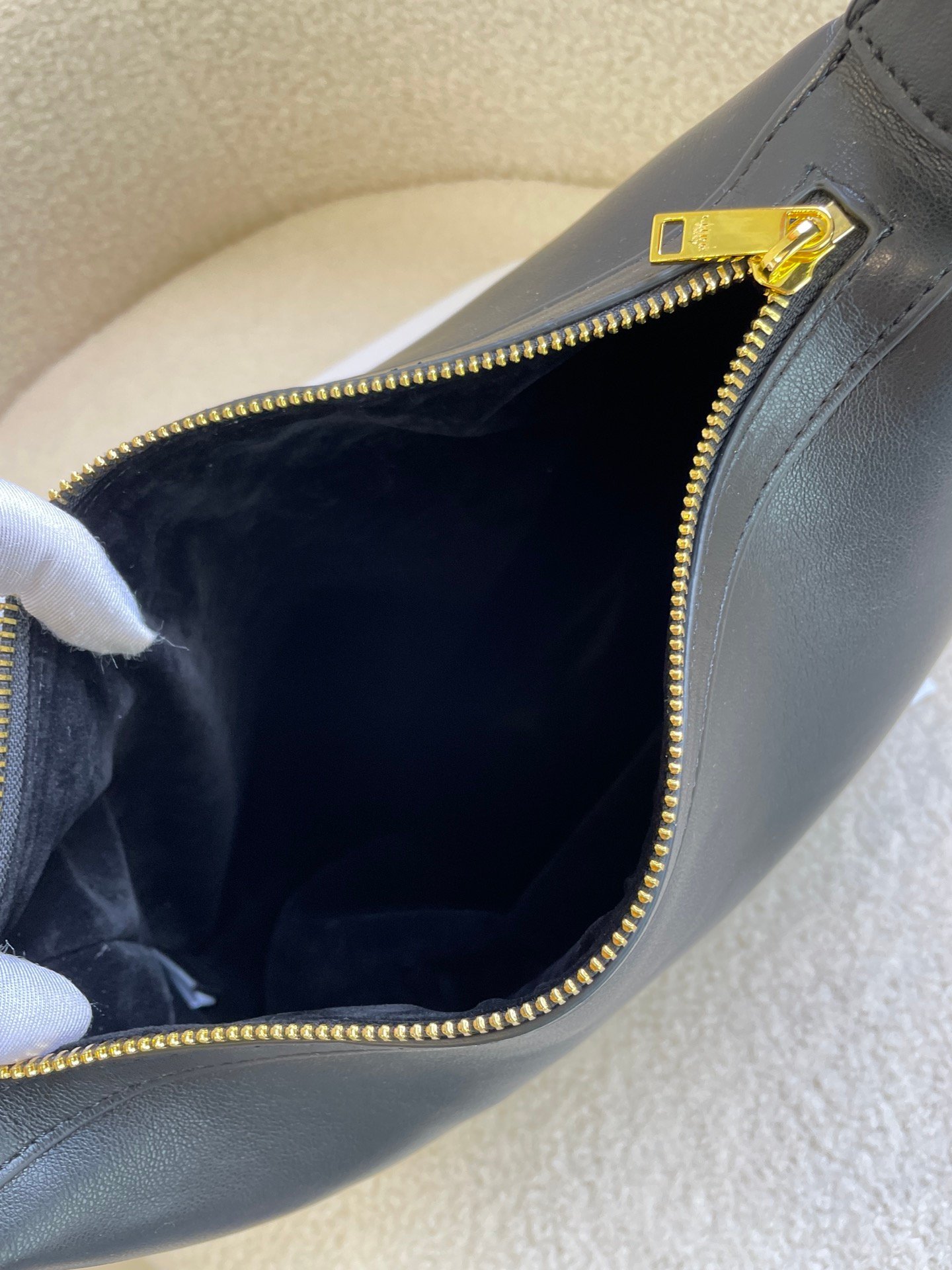 Soft calfskin handbag, size 30 x 28.5 x 8 cm, calfskin leather, suede calfskin lining, gold finish, shoulder carry, zipper closure, one main compartment, adjustable shoulder strap.