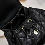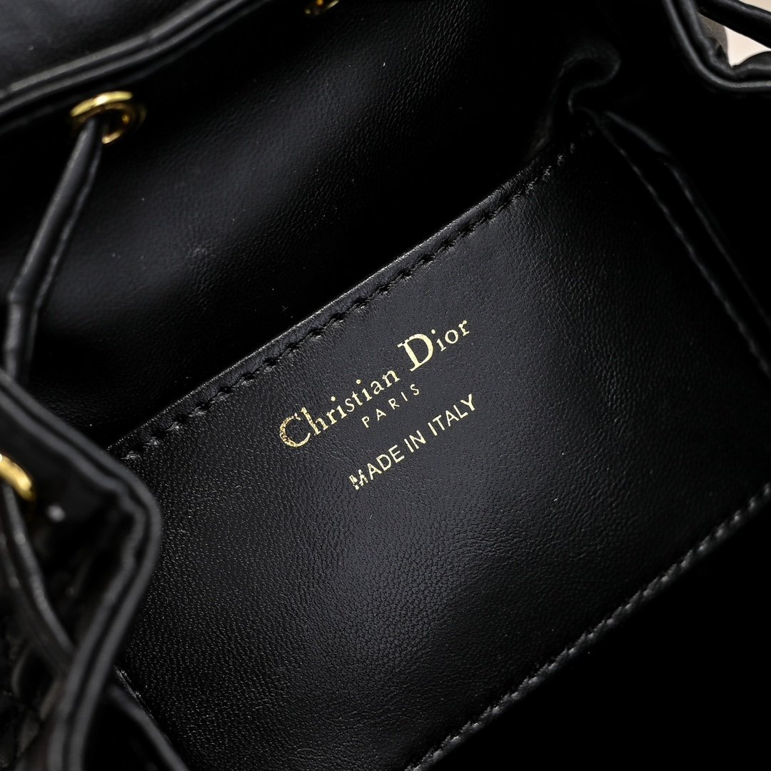 Small size. This Dior Caro backpack is a new product of the early spring ready-to-wear collection in 2025, showing a fashionable and elegant style. Meticulously crafted, it is paired with oversized cannage topstitching to enhance the style. The flap is decorated with a retro gold-finished metal CD logo. After opening, there is a drawstring main compartment. The small flap pocket can hold various daily necessities. Paired with a gold-finished handle and an adjustable shoulder strap for added comfort.