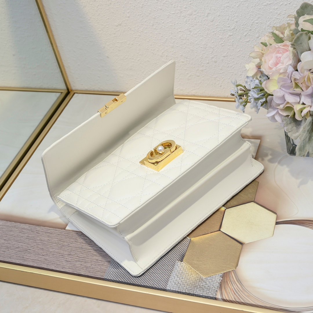 Start Dior’s new series with an elegant and fashionable aesthetic style. With oversized cannage topstitching, a stiff retro gold-finished metal top handle engraved with the Christian Dior Paris logo. The flap is decorated with a CD clasp embellished with resin beads. The silhouette with triangular lining is matched with two spacious compartments and an insert pocket, which can hold various daily necessities. The design is elegant. The adjustable and detachable chain shoulder strap is composed of gold-finished metal CD chain links embellished with resin beads. It can be carried by hand, on the shoulder or crossbody.
