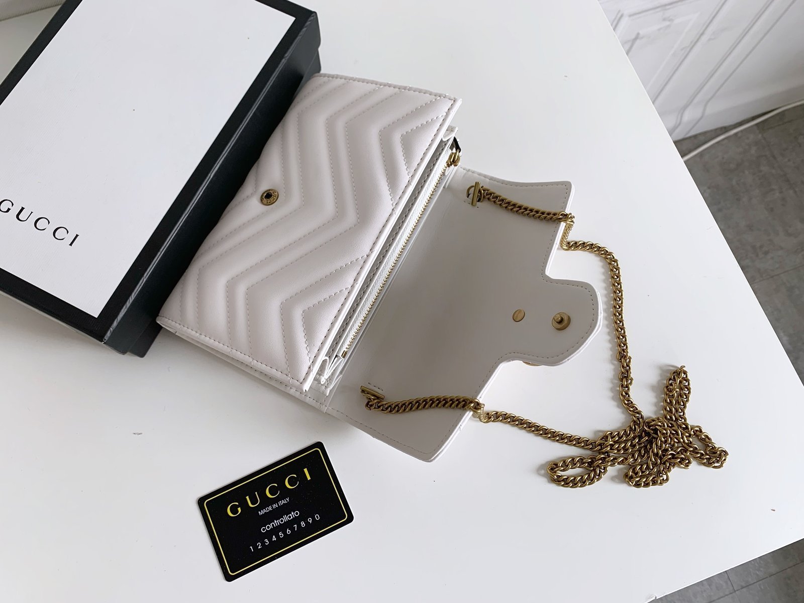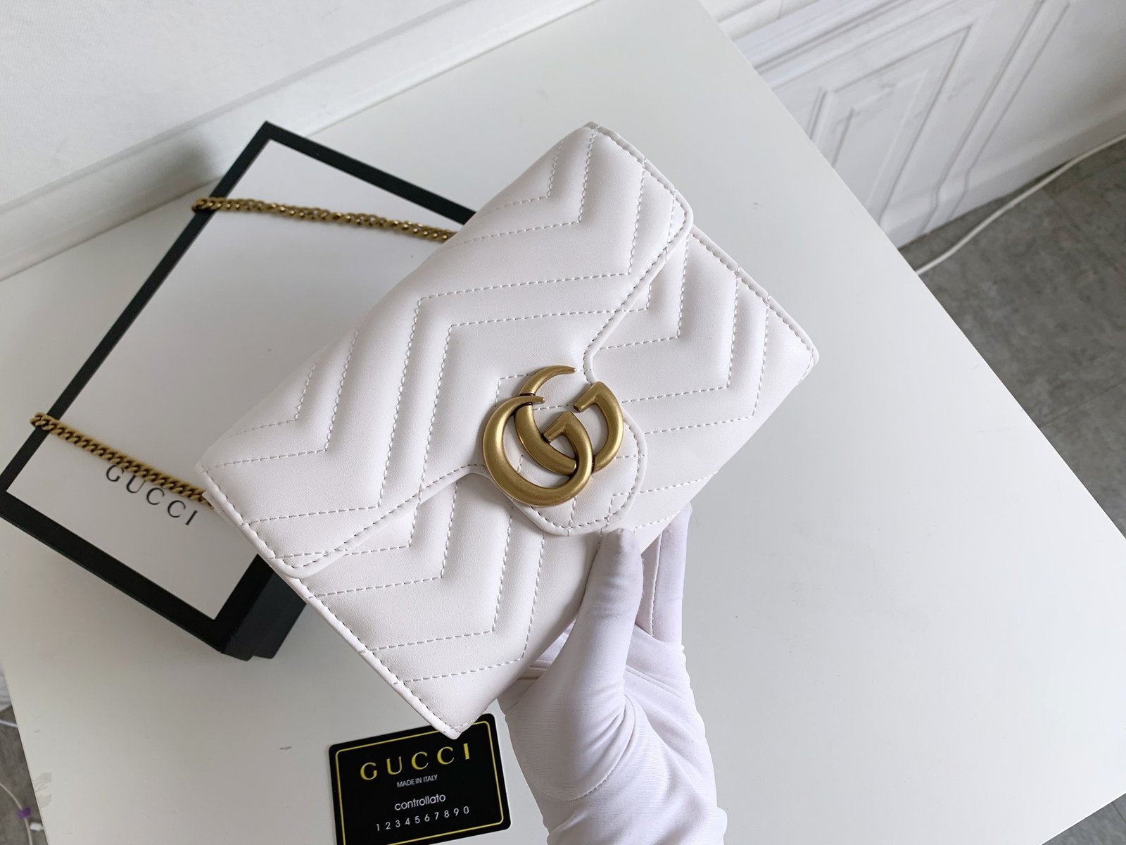 [G] 🔥🔥🔥 The Marmont mini chain bag features a rather structured soft shape.👏🏻 The flap is equipped with retro golden double G hardware.😍💋 The back is decorated with double G embroidery.🌹 It is made of quilted human-shaped Italian leather.👏🏻 Structured soft shape.👏🏻 Model: 47457520. Size: w20×h13×d6.
