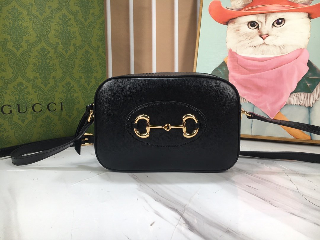 [New series presents the Horsebit 1955 series small shoulder bag, which combines versatility and practicality. This shoulder bag is crafted with classic black leather. The zipper closure and adjustable shoulder strap make the whole design more complete.