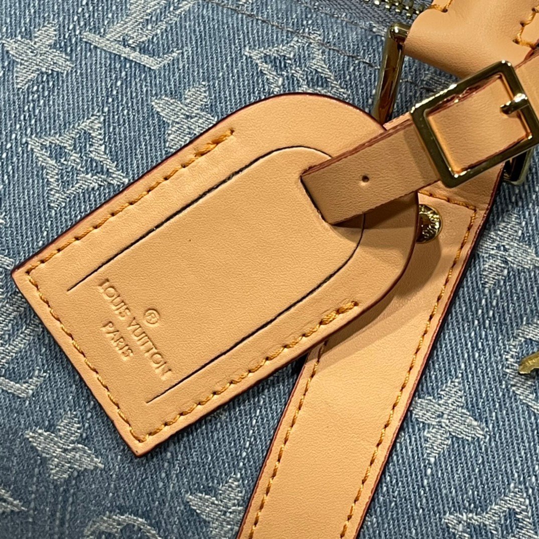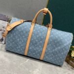 This Keepall Bandoulière 50 travel bag is woven in cotton denim in a Monogram pattern, bleached and sand washed for a retro look. Cow leather molded handle and removable and adjustable shoulder strap for a subtle aged effect, top handle and removable and adjustable shoulder strap for easy boarding. Dimensions: 50-29-22 cm