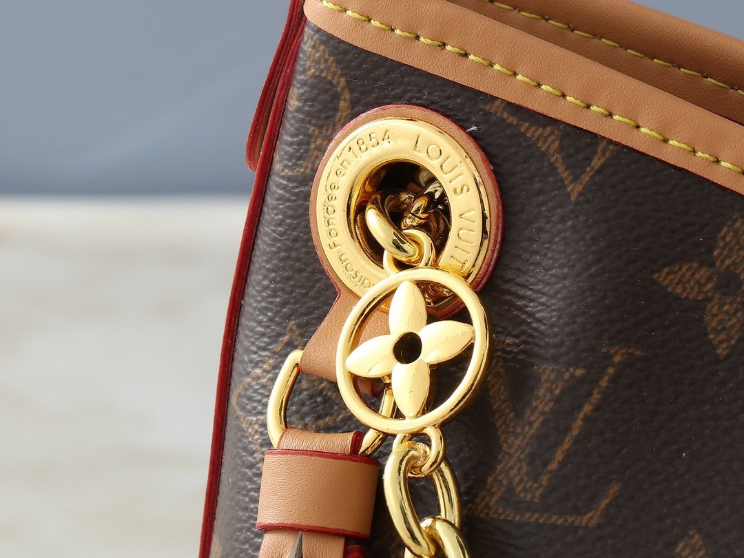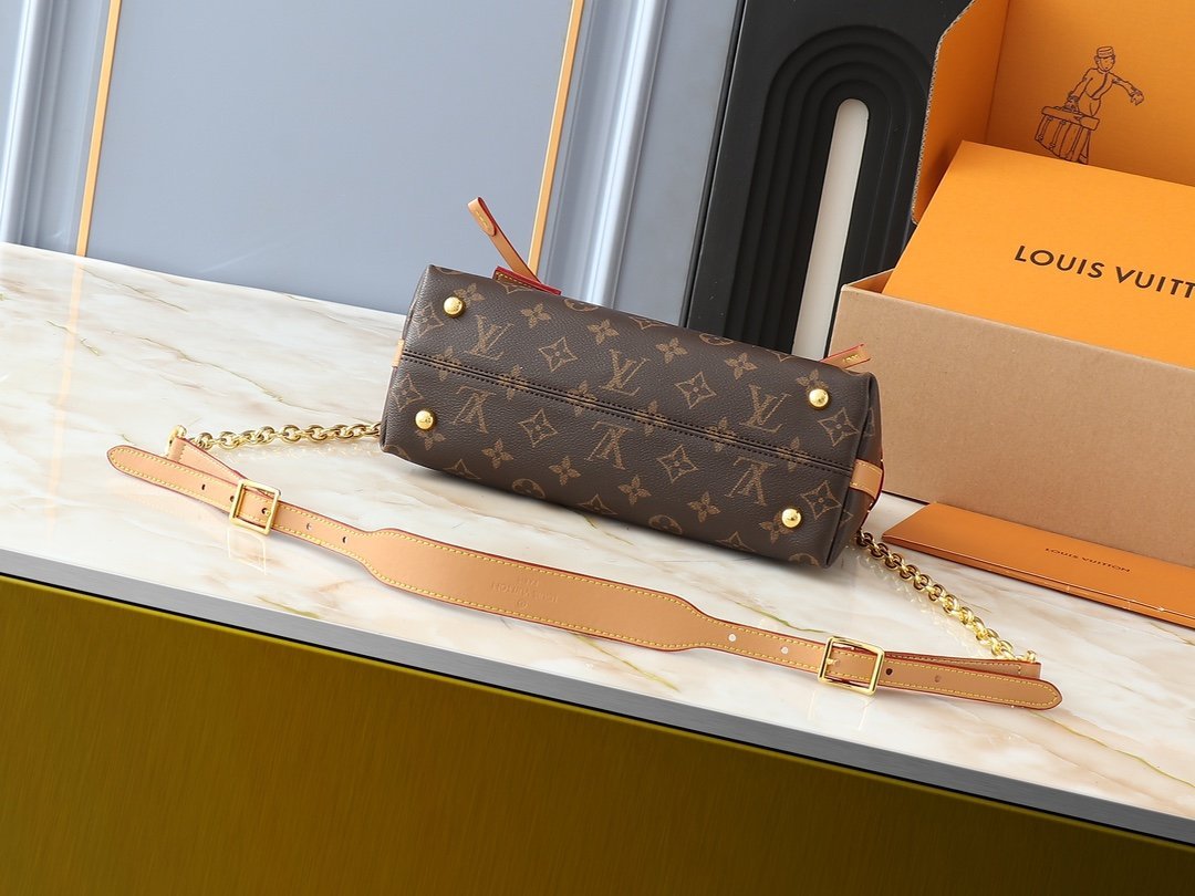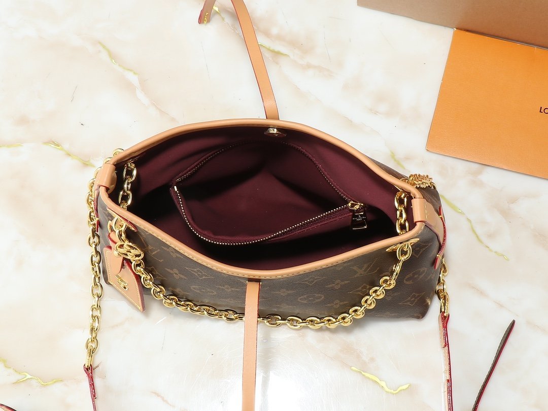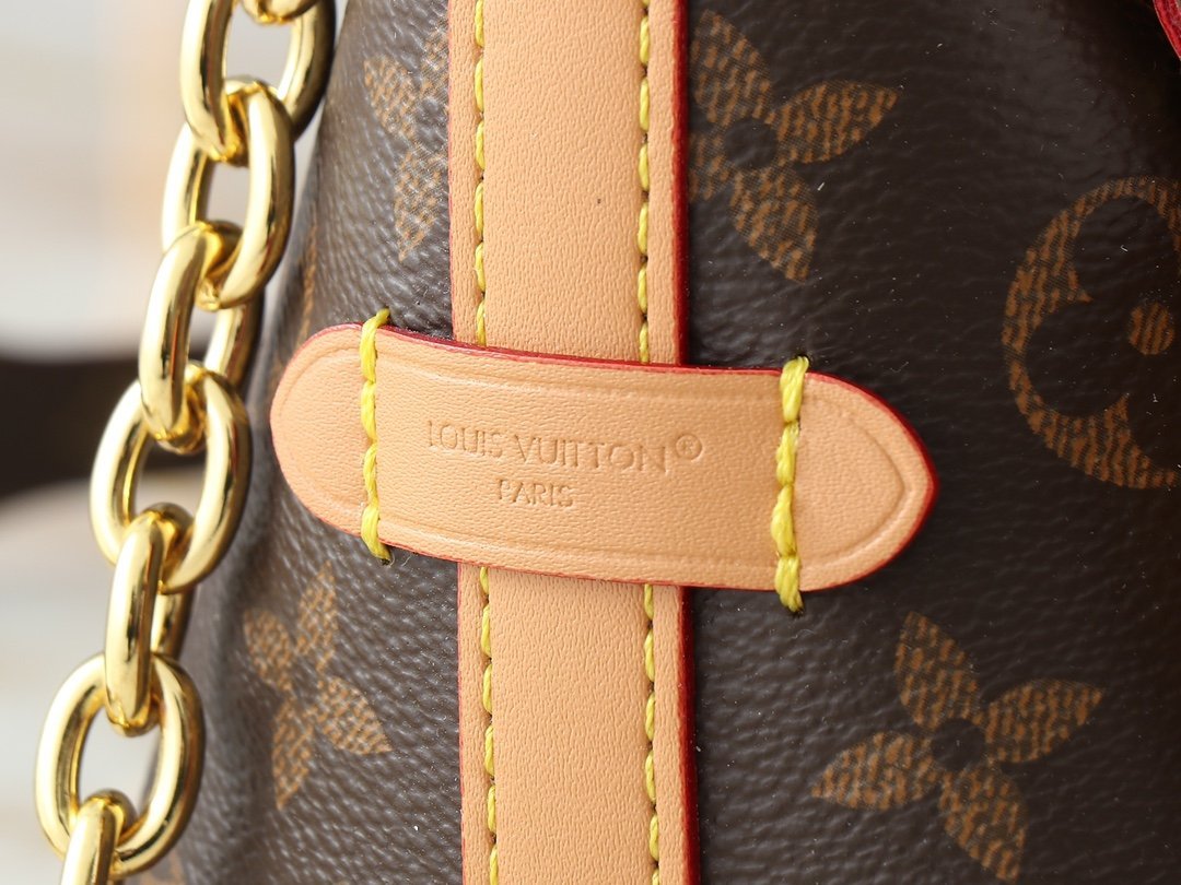 Upgrade the original M13014 M24860. This CarryAll BB handbag is made of Monogram canvas and adorned with Monogram flowers on the dazzling chain. It lights up day and night occasions with a trendy attitude. The leather name tag and drawstring closure complement each other. The zippered inner pocket is convenient for daily access to credit cards. Size: 26.0 x 17.0 x 10.0 cm.