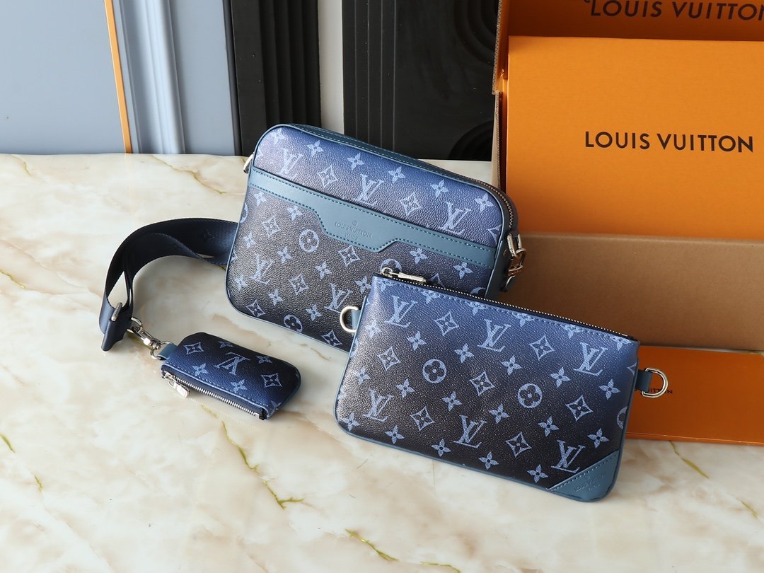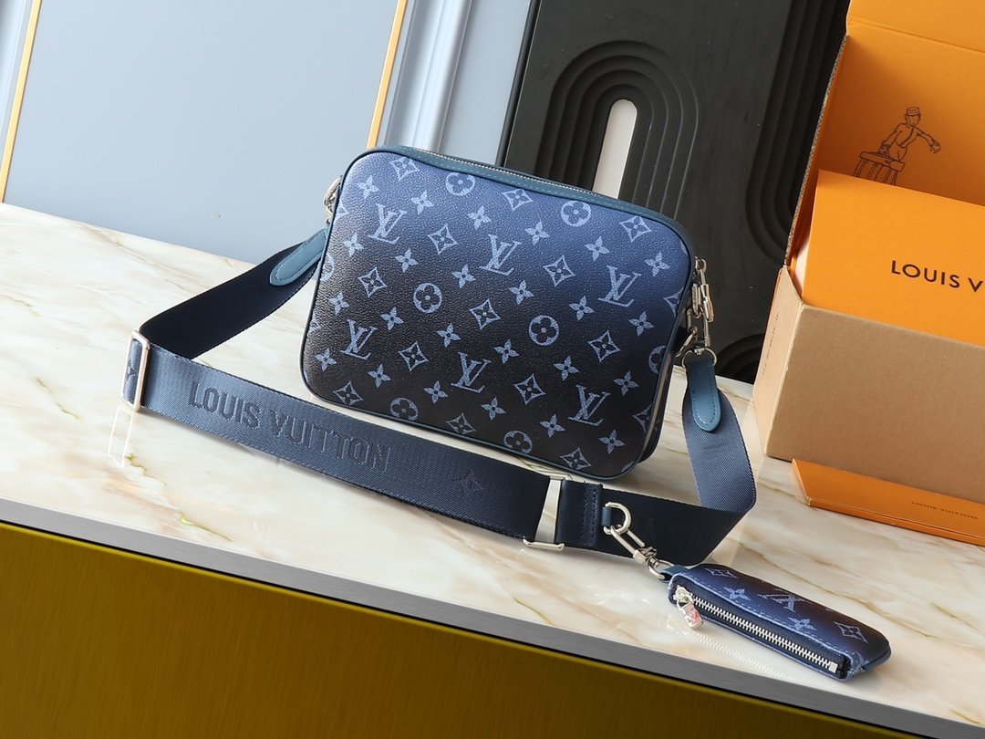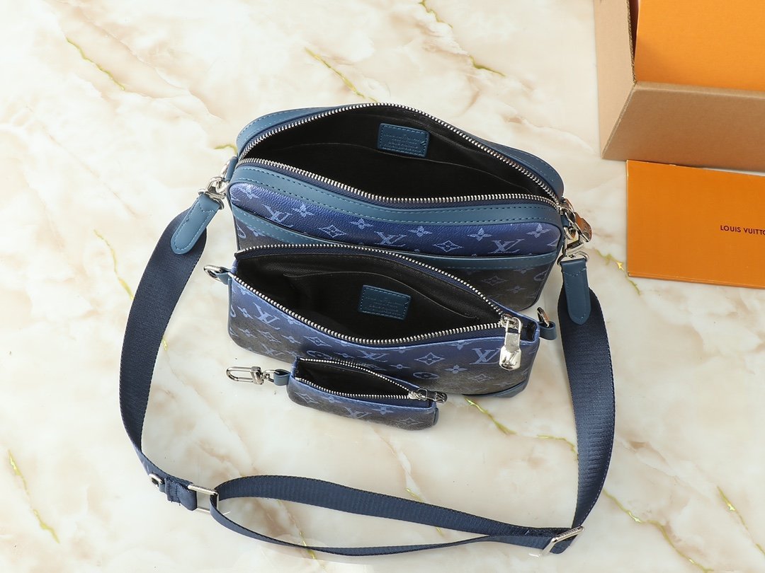 Upgrade the original M11648, M11645, M24754, M46603, M46602, M46604, M69443. This Trio messenger bag is made of Monogram embossed cowhide leather. The small coin purse on the front zipper pocket and shoulder strap is detachable. Together with the main compartment, it enriches the functional design. The detachable and adjustable jacquard fabric shoulder strap is marked with the brand logo, providing a comfortable shoulder and crossbody experience. Size: 25×18.5×7cm.