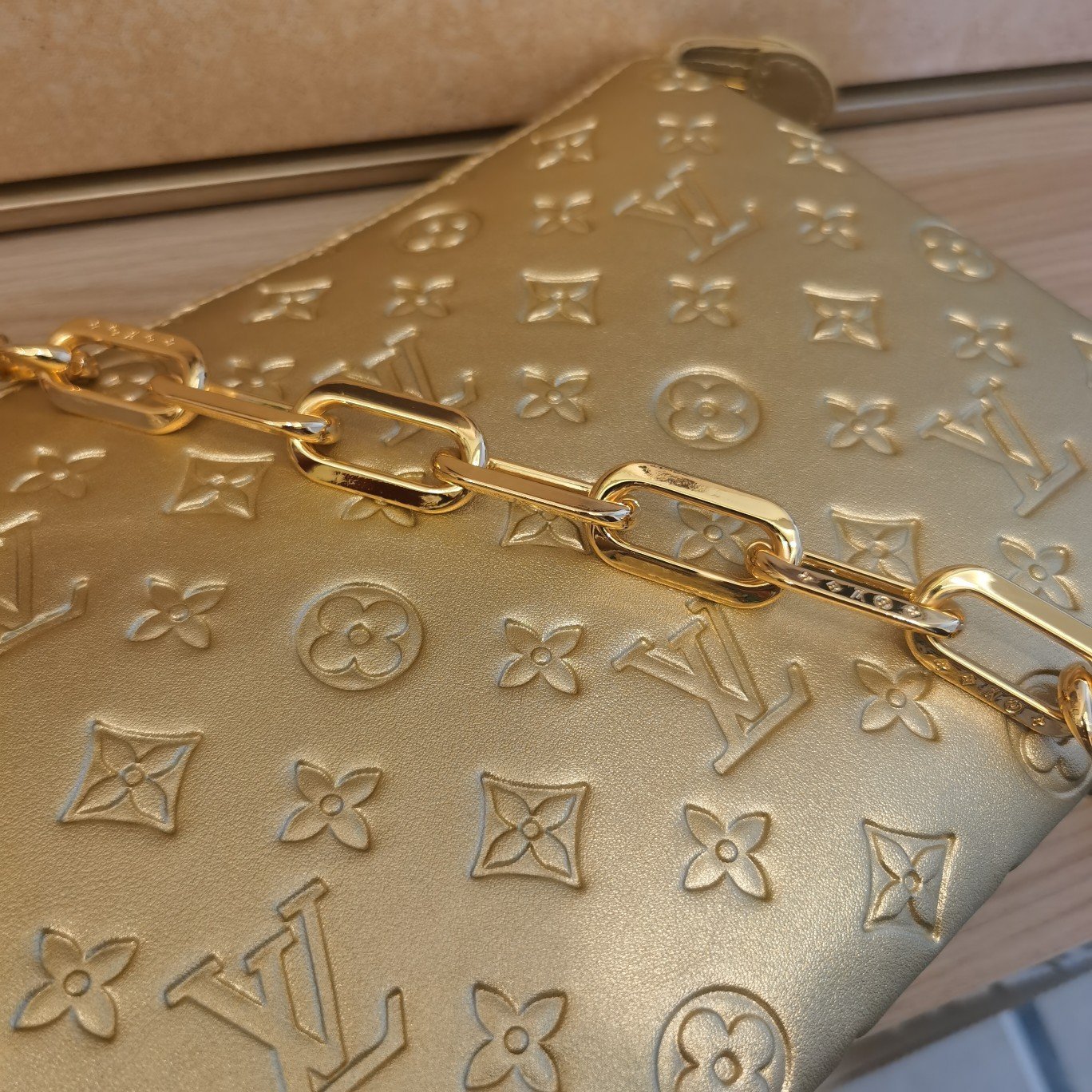 The top-of-the-line original M57793 57790 apricot Coussin small handbag shines at the Spring/Summer 2021 fashion show. Monogram embossed fluffy sheepskin creates a pillow configuration that injects avant-garde style into the minimalist design. Can be carried under the arm with a strap crossbody or an avatar chain baguette bag. Dimensions: 26 x 20 x 12 cm