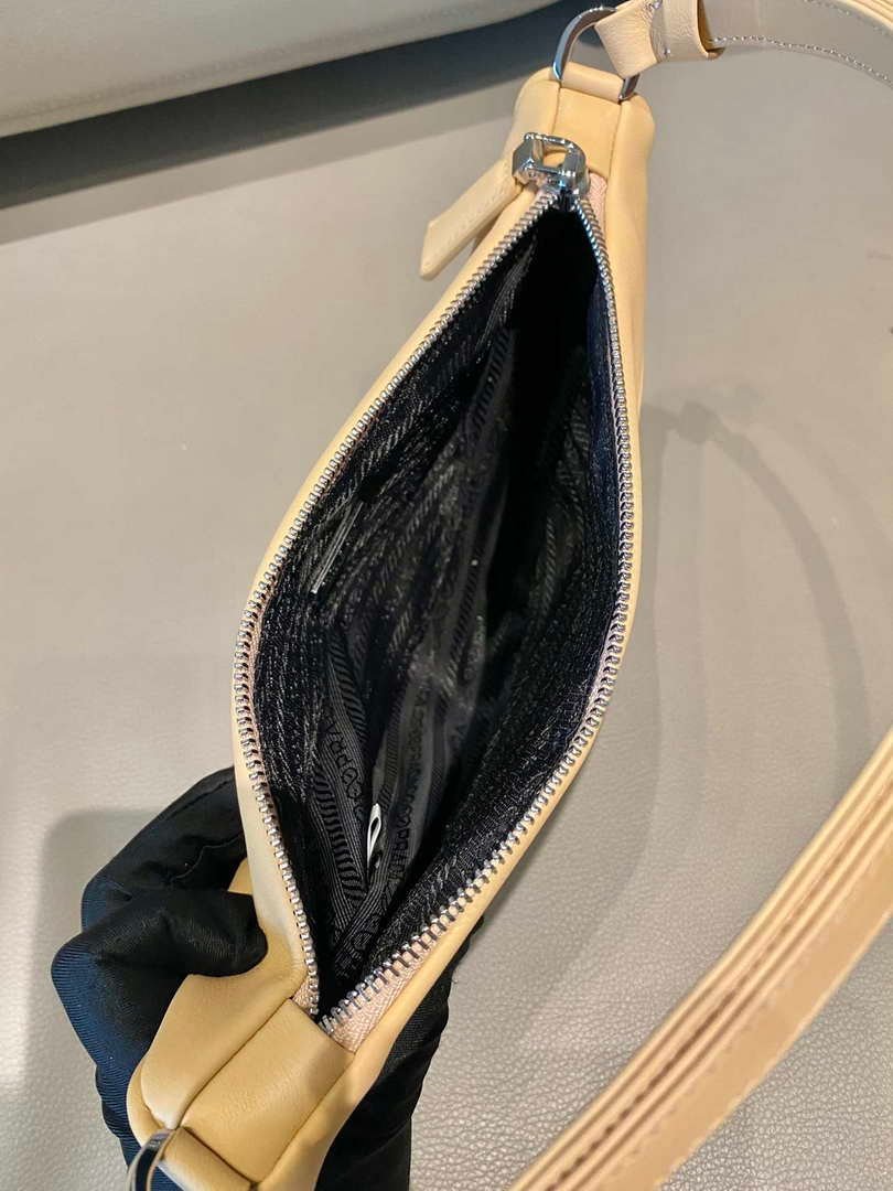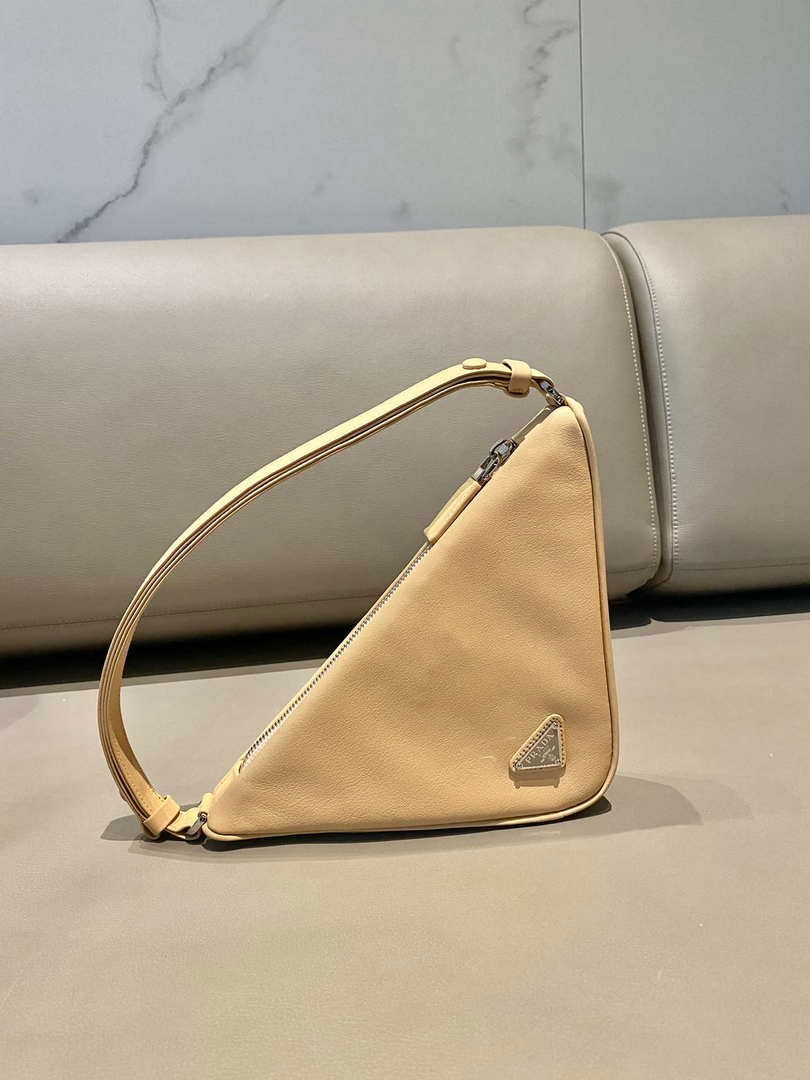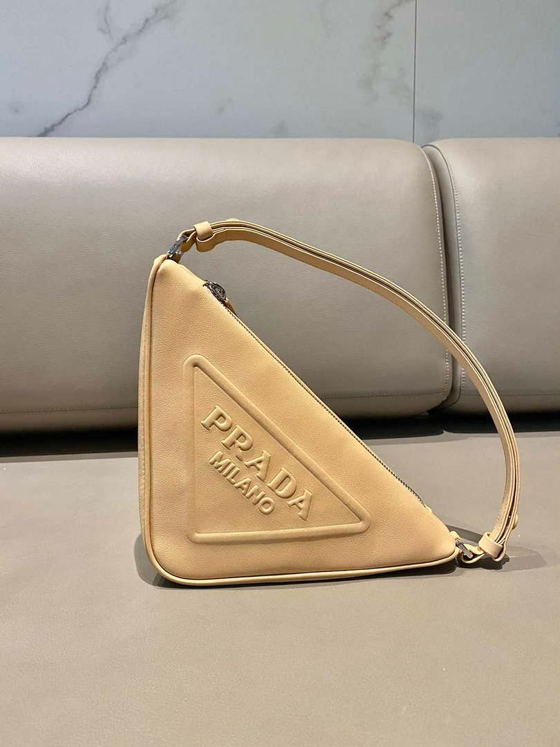 Prada 1NQ043 Triangle leather pouch Apricot on sale now.