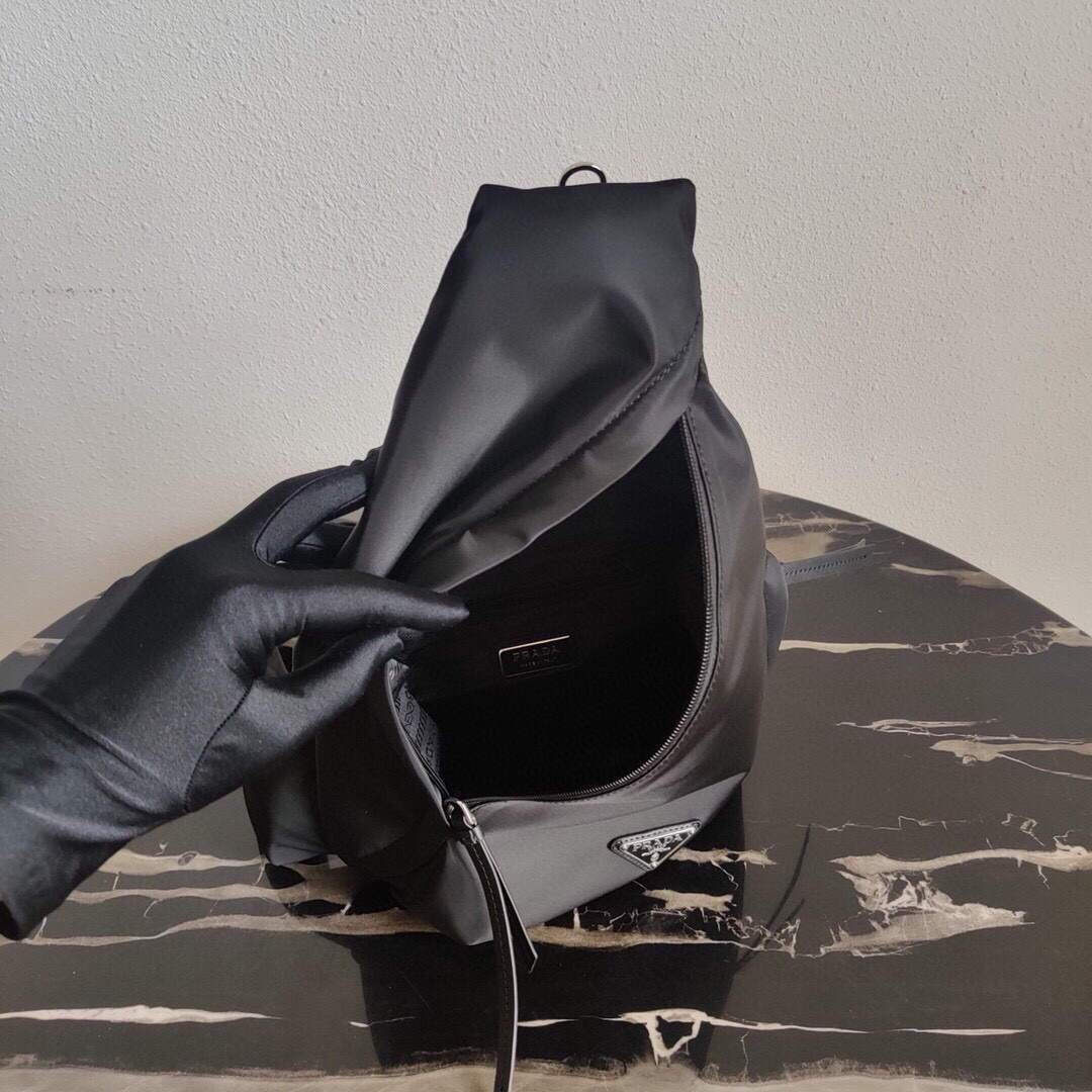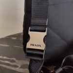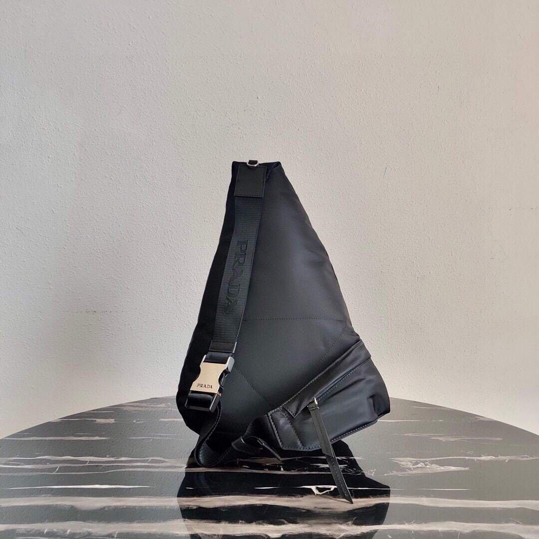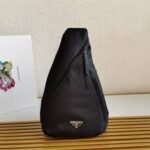 Sleek. minimalist lines are the choice for the new men’s bags for Fall Winter 2021. Defined by its hybrid design. halfway between a backpack and shoulder bag. this accessory has one adjustable woven nylon shoulder strap with side-release buckle and is decorated with the iconic enameled metal triangle logo. The silhouette is made of innovative Re-Nylon. a regenerated yarn produced from recycled plastic trash collected in the ocean.