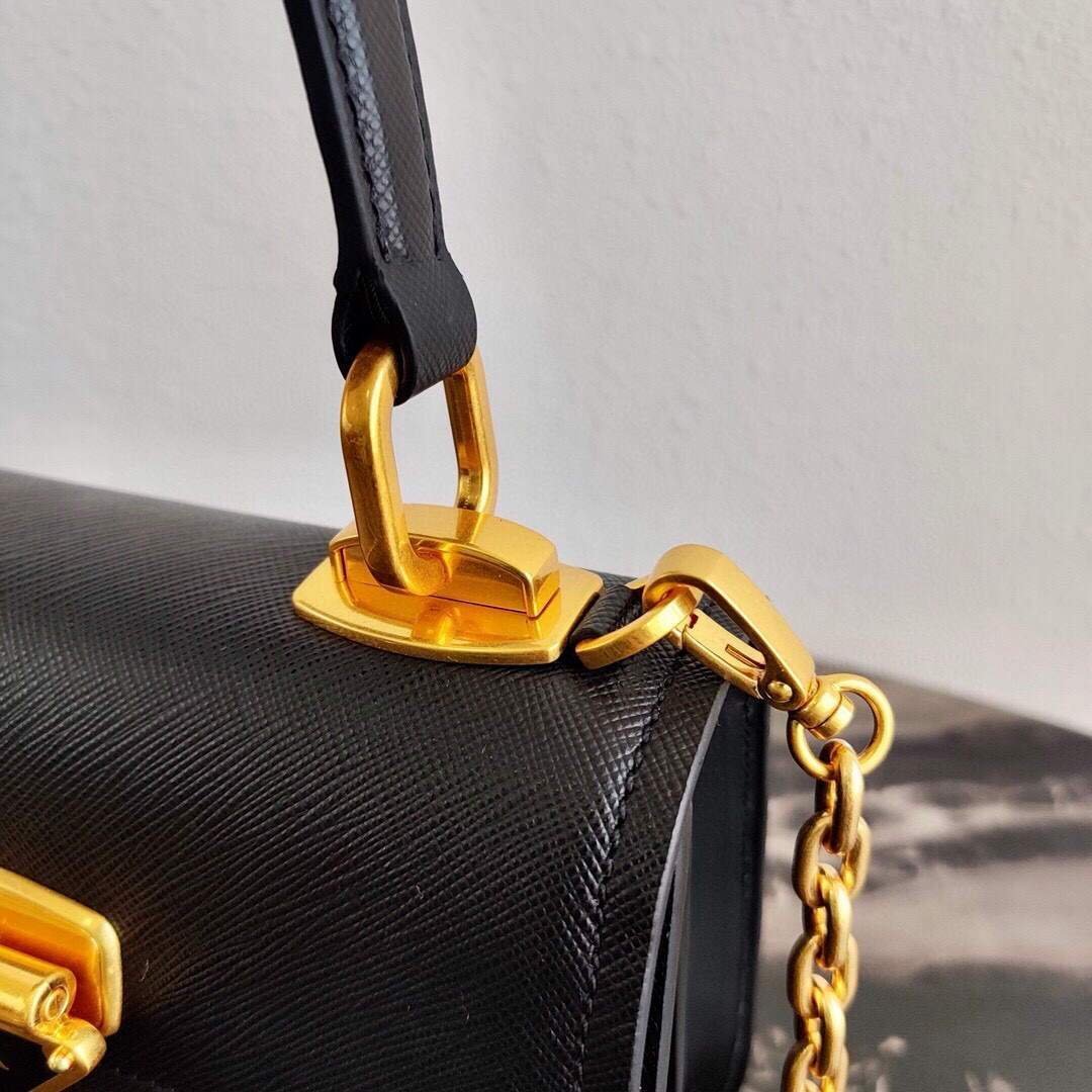 The sleek. formal line of this Saffiano leather handbag is animated with sophisticated details such as the distinctive metal triangle logo on the clasp. The bag has a chain shoulder strap with leather shoulder pad.