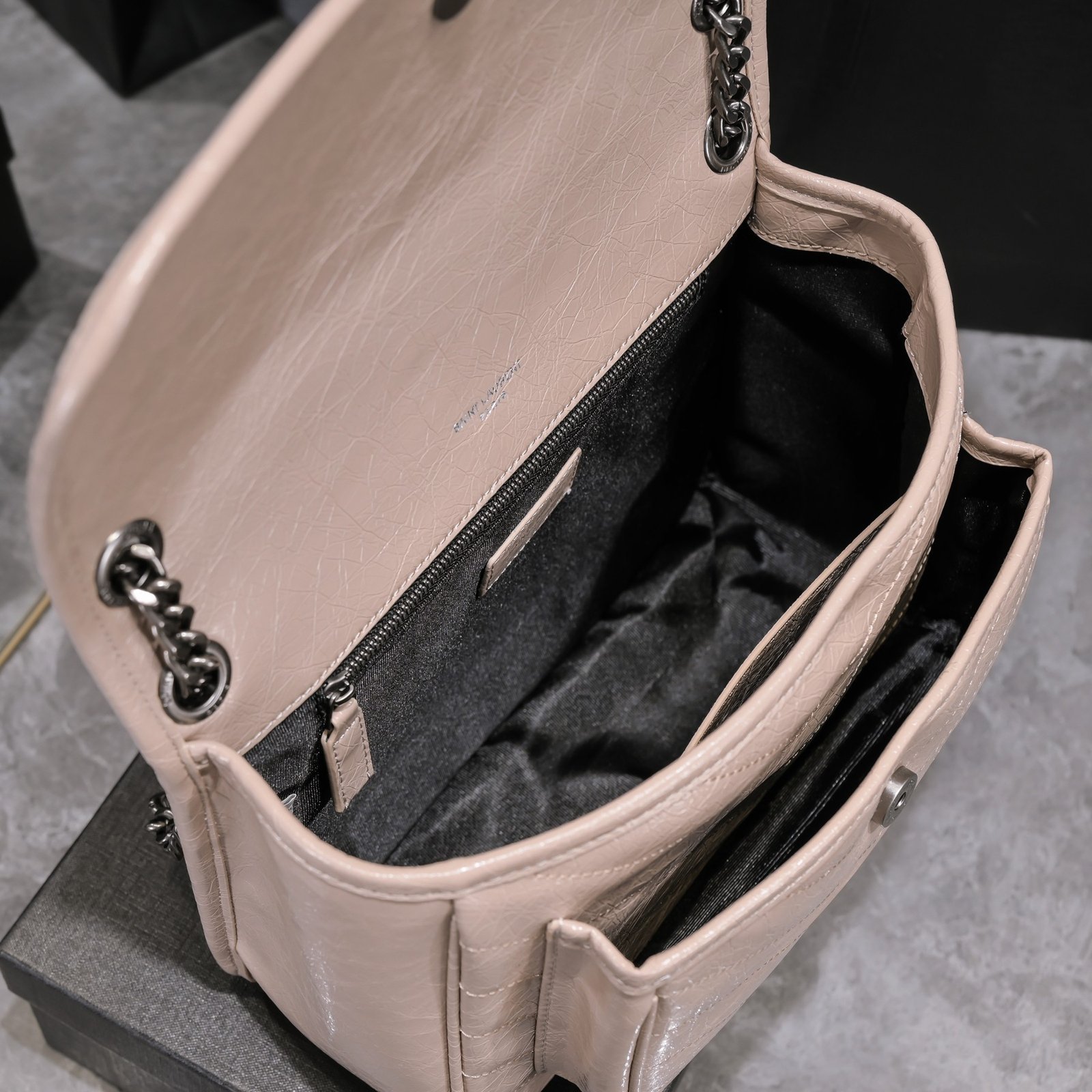 Large Saint Laurent Niki messenger bag – top Italian two-tone baked tar cowhide paired with vintage hardware. The texture and gloss are very unique! The hardware is even more special. The surface of the hardware LOGO is wrapped in cowhide! Two compartments, one zipper pocket, super large capacity! The oiled wax leather of the bag body is extremely soft to the touch and can be bent at will without any problem. Model: 498894. Size: 28x20x8cm.